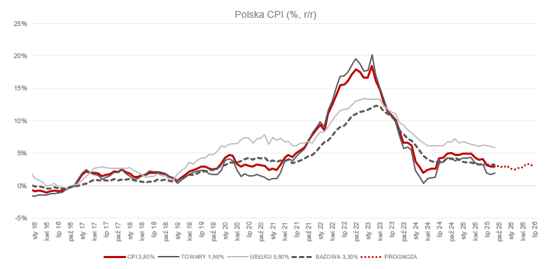 Zgodnie z informacją podaną przez GUS tempo inflacji konsumenckiej, wg szybkiego szacunku, wyniosło w październiku 2025 r 2,8% r/r. Była to wartość niższa od oczekiwań na poziomie 3,0% r/r. W ujęciu miesięcznym tempo wzrostu cen wyniosło 0,1%. Wg GUS ceny żywności i napojów alkoholowych nie zmieniły się w stosunku do września, a wzrosły ceny nośników energii i paliw do prywatnych środków transportu.