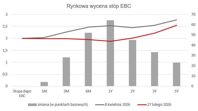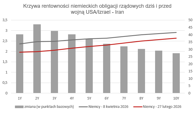 W odniesieniu do polityki Europejskiego Banku Centralnego rynek obecnie wycenia 2 podwyżki stóp procentowych w tym roku (pierwsza już w czerwcu), a w dłuższym terminie wzrost do ok. 2.8% z obecnych 2%. Warto odnotować, że jeszcze w lutym dominującym scenariuszem były pierwsze podwyżki dopiero pod koniec 2027 lub w 2028 roku, a cała krzywa przesunęła się w górę kilkadziesiąt punktów bazowych. W naszej ocenie tak silna reakcja rynku jest nieco przesadzona a faktyczna skala i tempo zacieśnienia mogą okazać się znacznie skromniejsze. Należy pamiętać, że w obliczu obserwowanych obecnie szoków podażowych skuteczność zacieśniania polityki pieniężnej pozostaje ograniczona, a kondycja niemieckiej gospodarki, znajdującej się w stagnacji od pandemii i w praktyce w kryzysie od 2022 roku, znacząco ogranicza pole do silnych podwyżek. Ewentualna mniejsza skala zacieśnienia monetarnego byłaby zdecydowanie korzystna dla wycen obligacji.