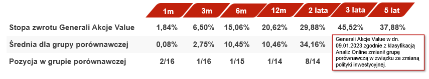 Konsekwentnie realizowana strategia w 2025 roku zaowocowała solidnym wynikiem. Stopa zwrotu Generali Akcje Value za 12 miesięcy wyniosła 20,62% przy średniej dla grupy realizującej podobną strategię na poziomie 10,46%. W efekcie subfundusz rok zakończył na 1. miejscu w swojej grupie porównawczej.
