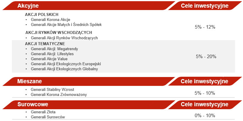 Jest to informacja reklamowa. Wszelkie prognozy lub scenariusze dotyczące przyszłości stanowią opinię Generali Investments TFI S.A. na dany dzień i nie stanowią gwarancji osiągnięcia podobnych wyników w przyszłości. Przedstawione cele inwestycyjne są oparte na szacunkach i wynikach brutto – nie uwzględniają prowizji oraz opłat zarządzania, które obniżają realną stopę zwrotu z inwestycji. Materiał nie jest dokumentem informacyjnym wymaganym na mocy przepisów prawa i nie zawiera informacji wystarczających do podjęcia decyzji inwestycyjnej.