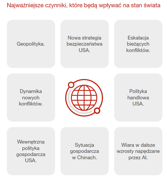 W najbliższych latach globalną sytuację będą kształtować narastające napięcia geopolityczne, a kluczową rolę odegra strategia bezpieczeństwa USA i relacje z Chinami. Coraz większe znaczenie zyskuje technologia, zwłaszcza sztuczna inteligencja, która staje się motorem wzrostu gospodarczego. Istotnym wydarzeniem ostatnich dni było odwołanie się Donalda Trumpa do doktryny Monroe’a, przekształconej w „doktrynę Donroe’a”. Podkreśla ona konieczność odzyskania amerykańskiej dominacji w regionie oraz ograniczania wpływów Rosji i Chin, szczególnie w kontekście strategicznych zasobów i infrastruktury wojskowej. To nowe podejście będzie jednym z najważniejszych czynników ryzyka w 2026 roku, powodując utrzymanie się bądź wzrost niepewności politycznej i gospodarczej. Globalny handel towarowy słabnie, a jego znaczenie w światowym PKB maleje, podczas gdy rośnie rola usług cyfrowych i wymiany technologii, które stają się głównym polem rywalizacji. W danych makroekonomicznych widoczne są rosnące różnice między krajami. Efekty ceł i napięć politycznych wywołują nierównomierne tempo wzrostu. Wiele gospodarek plasuje się w strefie, gdzie bilans czynników gospodarczych i geopolitycznych przechyla się w stronę ryzyka dla pozytywnej dynamiki wzrostu gospodarczego. Polska również znalazła się w tej grupie z powodu ryzyka geopolitycznego, choć jej parametry makroekonomiczne pozostają solidne. W USA obserwuje się dynamiczny wzrost inwestycji w sztuczną inteligencję, które w 2026 roku mają wzrosnąć o 200 miliardów dolarów, przy jednoczesnym spadku nastrojów konsumentów i firm.
