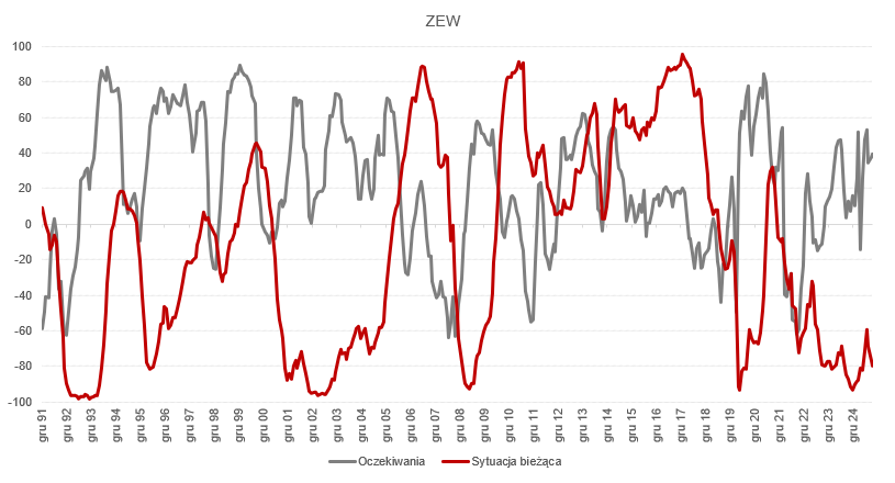 Wg informacji podanych przez niemiecki ZEW oczekiwania dotyczące sytuacji gospodarczej Niemiec nieznacznie wzrosły w październiku 2025 r., osiągając poziom +39,3 pkt, czyli o 2,0 pkt więcej niż w poprzednim miesiącu. Natomiast oceny bieżącej sytuacji gospodarczej nadal są pesymistyczne i wykazują tendencję spadkową. Wskaźnik oceny sytuacji bieżącej dla Niemiec wyniósł -80,0 pkt, co oznacza spadek o 3,6 pkt w porównaniu z wartością z września.