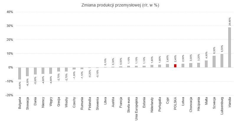 Według wstępnych szacunków Eurostat produkcja przemysłowa w sierpniu wzrosła po korekcie o 1,2% m/m w strefie euro i o 1,0% m/m w całej Unii Europejskiej (ujęcie wyrównane sezonowo). W ujęciu r/r poziom produkcji zwiększył się zarówno w strefie euro, jak i Unii Europejskiej o 1,0%.