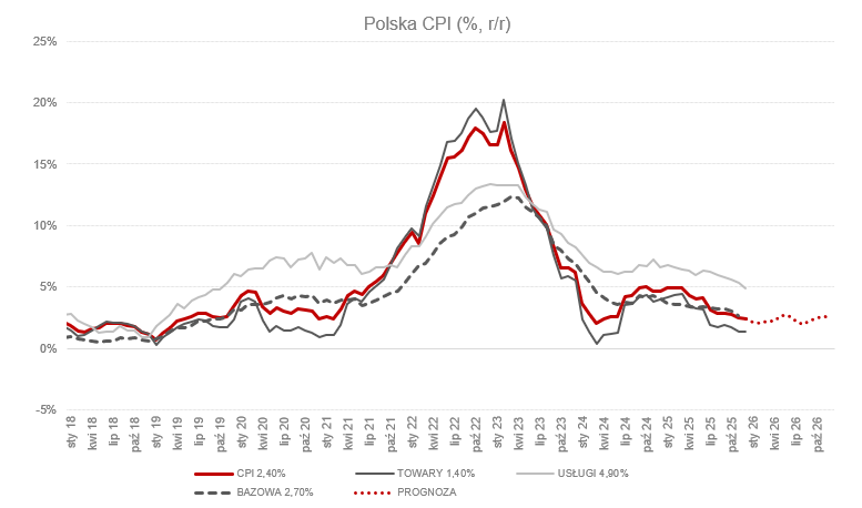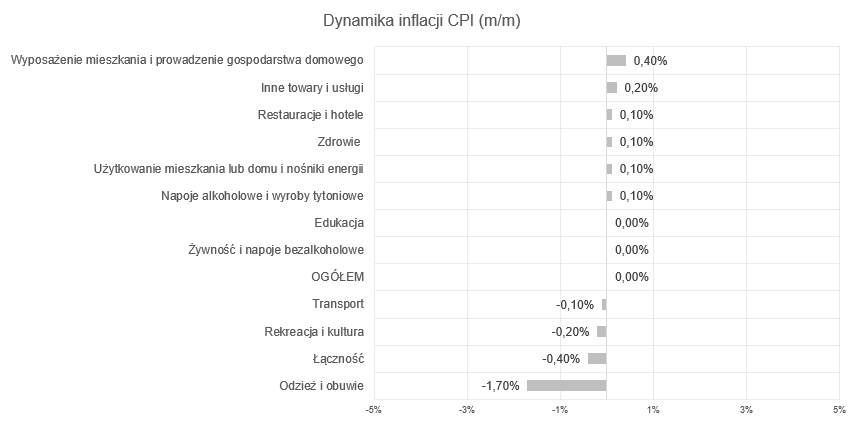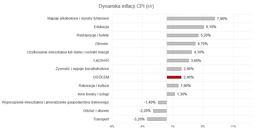 Wg informacji podanych przez GUS dynamika wzrostu cen w grudniu była zgodna ze wcześniejszym odczytem „flash” i wyniosła 2,4% r/r. Ceny usług wzrosły o 5,2% r/r, a ceny towarów o 1,3% r/r. W grudniu, w ujęciu r/r, spadły ceny odzieży i obuwia, wyposażenia mieszkania i prowadzenia gospodarstwa domowego oraz transportu. Ceny w pozostałych ugrupowaniach rosły.