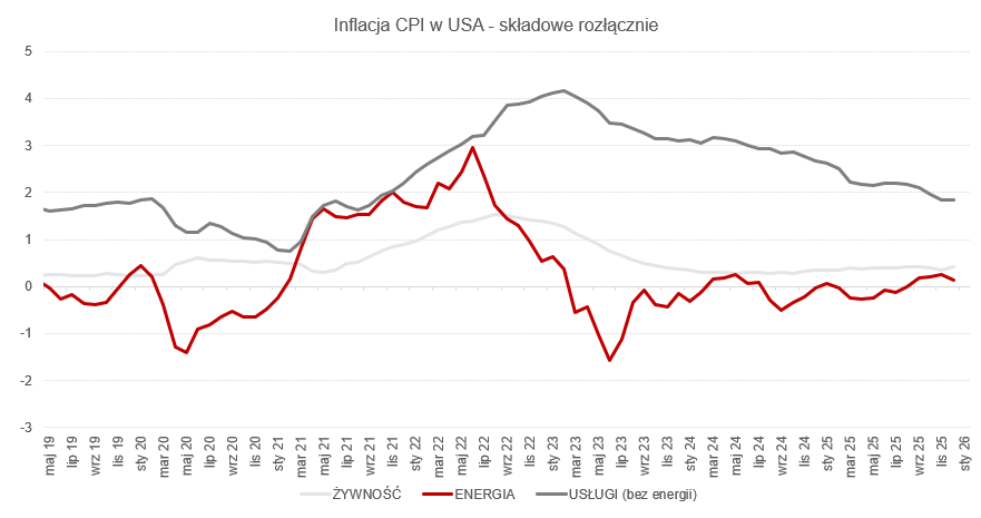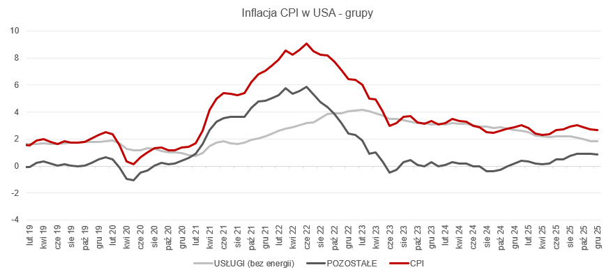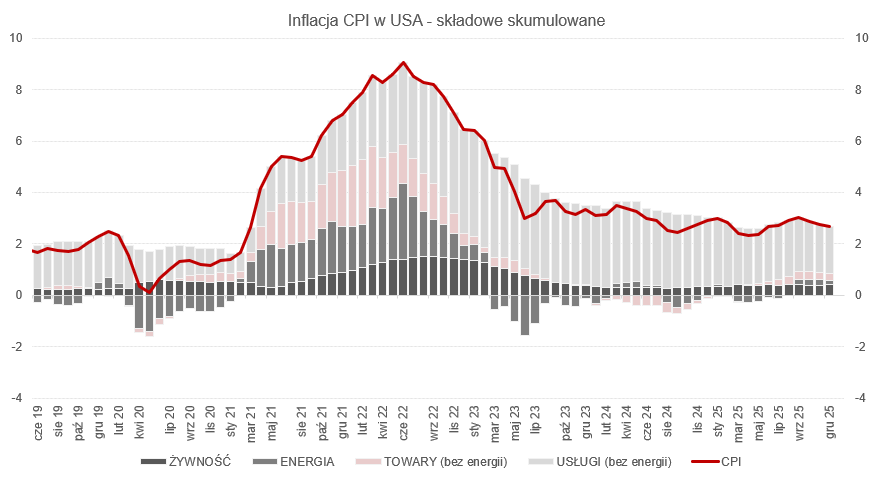 Poziom inflacji CPI w USA był w grudniu zgodny z oczekiwaniami i wyniósł 2,7% r/r. W ciągu miesiąca ceny urosły o 0,3%. Tzw. inflacja bazowa wyniosła 2,6% i była niższa od oczekiwań. Spośród poszczególnych składowych dominuje nadal wzrost cen usług.