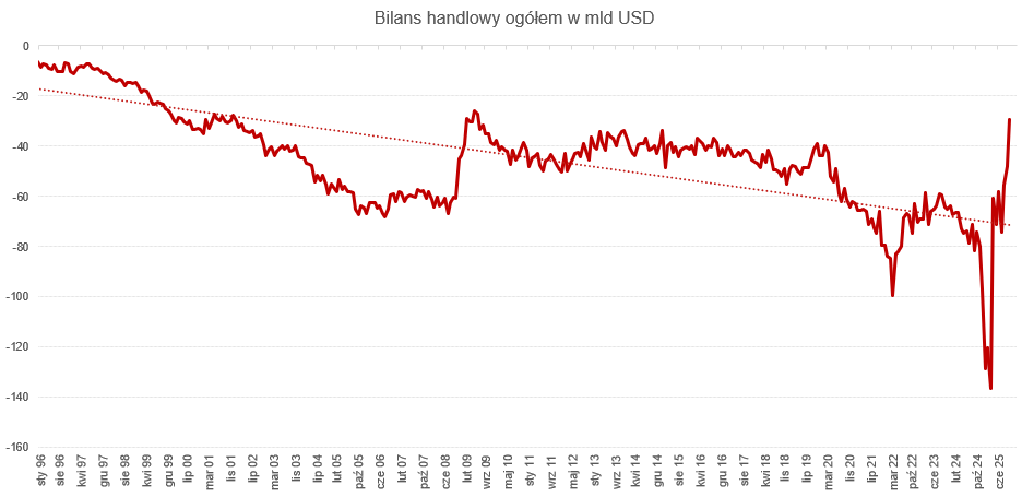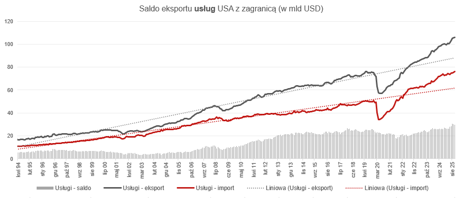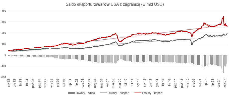 Spływają zaległe dane z gospodarki amerykańskiej. Saldo bilansu handlowego USA w październiku było zaskakująco wysokie względem oczekiwań. W rezultacie wzrostu eksportu o 2,6% m/m i spadku importu o 3,2% m/m odnotowano deficyt na poziomie 29,4 mld USD. Poziom deficytu był najniższy od 2009 r. Z -52,8 mld USD do 48,1 mld USD zrewidowano poziom deficytu za wrzesień. Wobec tak nieoczekiwanej dynamiki warto przyjrzeć się bliżej głównym kategoriom, które przyczyniły się do spadku importu i wzrostu eksportu. Jeżeli chodzi o eksport to kategorią o najbardziej zwiększonej wartości eksportu były surowce przemysłowe (+10,2 mld USD). Szczegółowa analiza poszczególnych ugrupowań wskazuje, że na to znaczące zaskoczenie miał wpływ wzrost salda eksportu złota niemonetarnego i innych metali szlachetnych (+10,2 mld opuściło netto USA) oraz spadek importu dóbr konsumpcyjnych, głównie farmaceutyków (poprawa salda o około 13,0 mld USD).