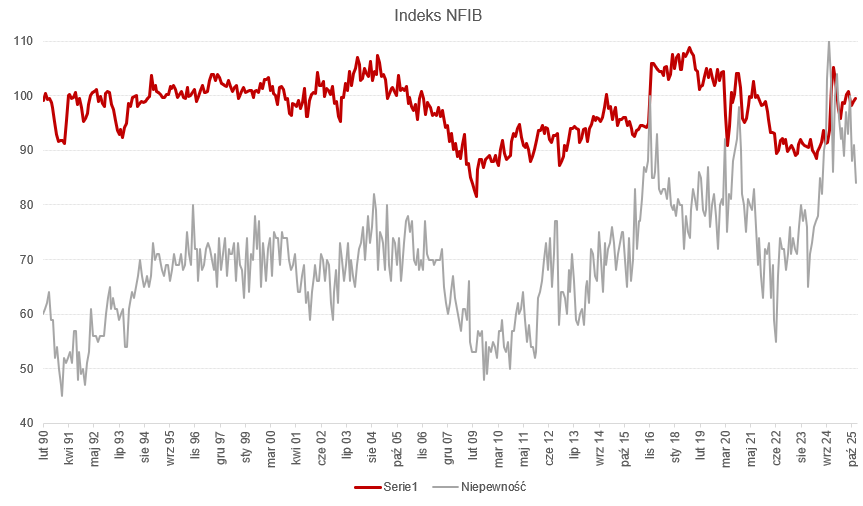 Publikowany przez National Federation of Independent Business wskaźnik optymizmu małych przedsiębiorstw (NFIB) wzrósł w grudniu o 0,5 punktu (do poziomu 99,5 pkt.) i utrzymał się powyżej swojej 52-letniej średniej wynoszącej 98. Spośród 10 składników indeksu optymizmu dwa wzrosły, trzy spadły, a pięć pozostało bez zmian. Wzrost indeksu optymizmu wynikał przede wszystkim ze wzrostu liczby osób oczekujących poprawy warunków biznesowych. Indeks niepewności spadł o 7 punktów w porównaniu z listopadem − do poziomu 84 pkt., najniższego od czerwca 2024 r. W publikacji zwrócono uwagę na obawy przedsiębiorców dotyczące podatków, ale jednocześnie spodziewają się oni, że w 2026 r. warunki gospodarcze będą korzystne dzięki zmniejszeniu presji kosztowej, złagodzeniu problemów związanych z zatrudnieniem i wzrostowi inwestycji kapitałowych.