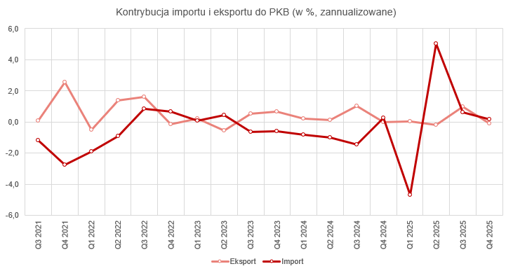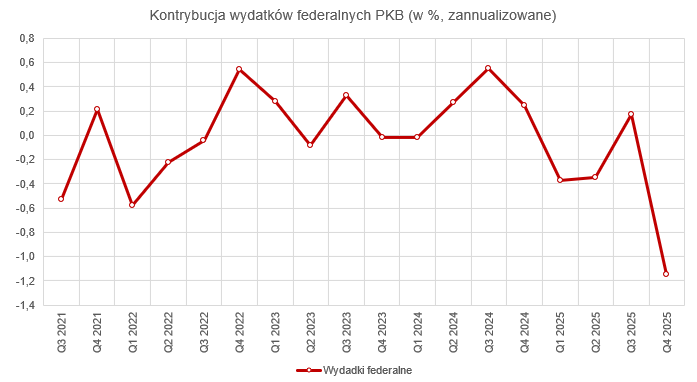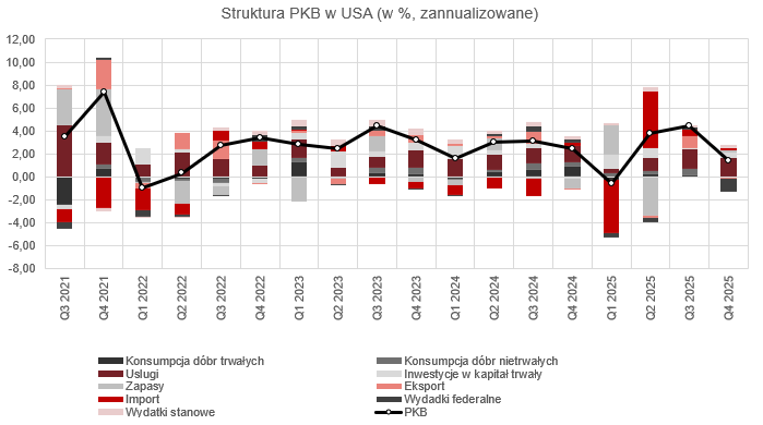 Według zaawansowanych szacunków, opublikowanych przez Amerykański Urząd Analiz Ekonomicznych (BEA), realny produkt krajowy brutto (PKB) wzrósł w IV kwartale 2025 r. o 1,4% w skali roku. Był to odczyt znacząco poniżej konsensusu rynkowego, który kształtował się na poziomie 2,8%. Do wzrostu realnego PKB w czwartym kwartale przyczyniły się wzrosty wydatków konsumpcyjnych i inwestycji. Zmiany te zostały częściowo zrównoważone spadkiem wydatków rządowych i eksportu. Zatem gdyby nie „shutdown”, który wniósł do tempa wzrostu dynamikę -1,2%, tempo wzrostu byłoby zbliżone do oczekiwań. Efekt ten powinien zostać zniwelowany w nadchodzących miesiącach. Dodatkowo na odczycie realnym zaważył wyższy od oczekiwań wzrost indeksu cenowego. Wskaźnik cen zakupów krajowych brutto (GDP Price Index) wzrósł w czwartym kwartale o 3,7% w porównaniu ze wzrostem o 3,4% w trzecim kwartale. Wskaźnik cen wydatków konsumpcyjnych gospodarstw domowych (PCE) wzrósł o 2,9% w porównaniu ze wzrostem o 2,8 % w listopadzie. Wyłączając ceny żywności i energii, wskaźnik cen PCE wzrósł o 2,7% w porównaniu z wzrostem o 2,9% w listopadzie.
