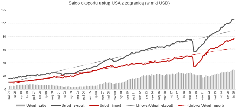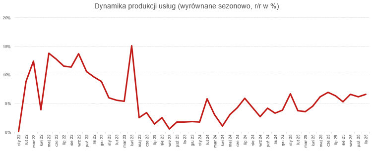 Według danych opublikowanych przez GUS produkcja usług w listopadzie 2025 r. wzrosła, w stosunku do listopada 2024 r., o 6,2% r/r. Dane z GUS są mocno opóźnione. Podano, że po wyeliminowaniu wpływu czynników o charakterze sezonowym produkcja usług wzrosła o 6,6% r/r.