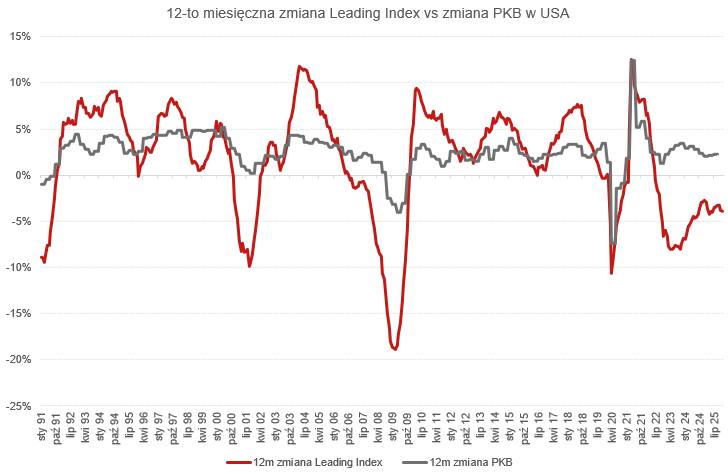 Wiodący indeks gospodarczy (Leading Index, LEI), opublikowany przez Conference Board dla Stanów Zjednoczonych, spadł w grudniu 2025 r. o 0,2% − do poziomu 97,6 pkt., po spadku o 0,3% w listopadzie i skorygowanym w dół spadku o 0,2% w październiku. Ogólnie rzecz biorąc index spadł o 1,2% w drugiej połowie 2025 r., co stanowi znaczną poprawę w porównaniu ze spadkiem na poziomie 2,8% odnotowanym w pierwszej połowie 2025 r.