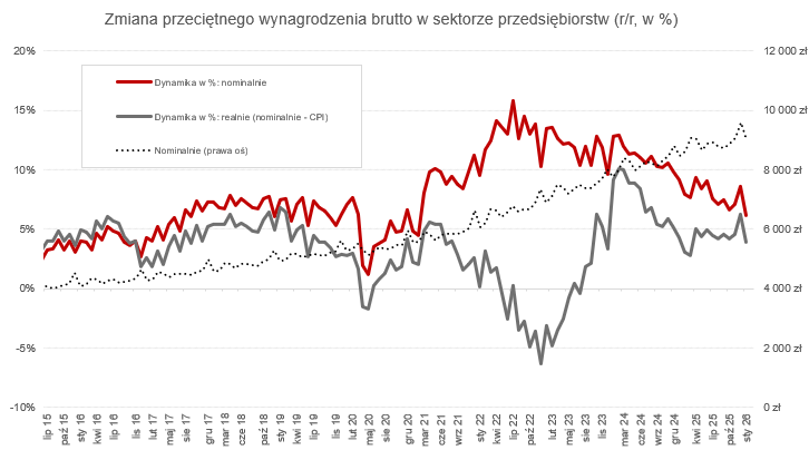 Według informacji GUS przeciętne miesięczne wynagrodzenie w sektorze przedsiębiorstw wyniosło w marcu 9 002,47 zł. Wynagrodzenia w ujęciu r/r wzrosły nominalnie o 6,13%, co było wartością poniżej oczekiwań. W ujęciu realnym (czyli po pomniejszeniu tempa wzrostu wynagrodzeń o spadające tempo wzrostu cen) dynamika wynagrodzeń wyniosła 3,93% r/r. Dynamika wynagrodzeń wpisywała się w roczny wzorzec sezonowy, natomiast wzorzec wskazuje, że cykliczny spadek wartości wynagrodzeń w styczniu w stosunku do grudnia powinien być nieco silniejszy.