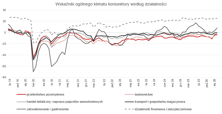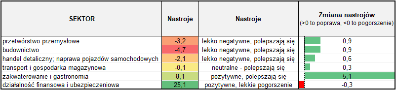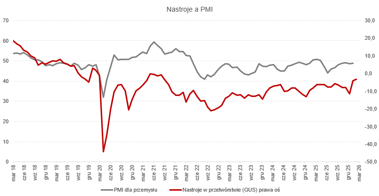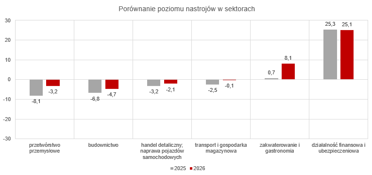 Zgodnie z informacjami podanymi przez GUS dynamiki nastrojów wśród polskich przedsiębiorców w każdym sektorze oprócz działalności finansowej były pozytywne. Poprawa nastrojów była jednak nieco słabsza niż w styczniu. Na tle wszystkich sektorów wyróżniał się sektor zakwaterowania i gastronomii, gdzie poprawa nastrojów była najwyższa od marca 2025 r. Nieco zaskakuje poziom nastrojów w budownictwie, ponieważ bardziej ostra zima niż w 2025 r. sugerowałaby raczej spadek nastrojów. Cieszy dalsza poprawa nastrojów w przetwórstwie przemysłowym.