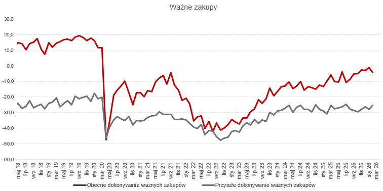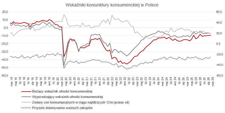 W lutym nastąpiło lekkie przyśpieszenie poprawy nastrojów konsumentów w Polsce. Bieżące nastroje konsumentów, mierzone bieżącym wskaźnikiem ufności konsumenckiej, pozostają na minusie i w porównaniu do grudnia polepszyły się o 0,5 p.p. Wartość bieżącego wskaźnika ufności konsumenckiej (BWUK), publikowanego przez GUS, wyniosła -9,1% i jest wyższa od wartości obserwowanej w lutym 2025 r. o 5,7 p.p. Polacy nieco bardziej pesymistycznie ocenili przyszłość. Wartość wskaźnika wyprzedzającego spadła o 0,3 p.p. Polacy nadal oceniają przyszłość z mniejszą dozą pesymizmu niż teraźniejszość. Oczekiwania inflacyjne obniżyły się. Pogorszyła się ocena bieżącej sytuacji finansowej i obecnej możliwości oszczędzania, która wróciła do poziomów wskazujących na lekki pesymizm. Polepszyła się ocena ogólnej sytuacji ekonomicznej w kraju. Pogorszyła się ocena bieżącego dokonywania ważnych zakupów, a polepszyła się ocena przyszłego ich dokonywania.