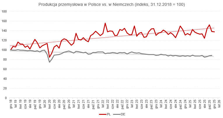 Wstępne dane za grudzień 2025 r., opublikowane przez U.S. Census Bureau, wskazują na niższy od oczekiwanego spadek zamówień na dobra trwałe − na poziomie 1,4%. W styczniu produkcja przemysłowa względem grudnia zwiększyła się o 0,7% wobec oczekiwań na poziomie 0,4%. Wykorzystanie mocy produkcyjnych wzrosło względem grudnia z 75,7% do 76,5%, ale było niższe od oczekiwań analityków.