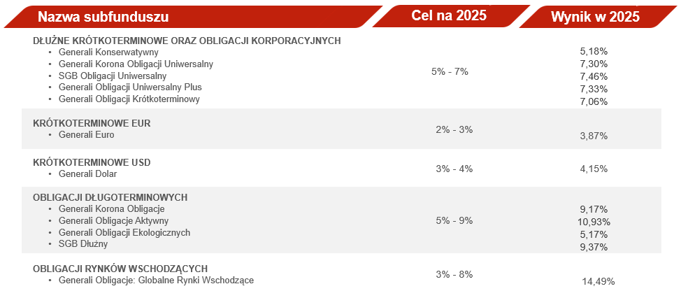 Subfundusze dłużne mogą 2025 rok zaliczyć do udanych. Szczególnie dobrze radziły sobie te skoncentrowane na długoterminowych obligacjach skarbowych. Solidne wyniki wspierały m.in. obniżki stóp procentowych w Polsce i na świecie oraz poprawa sytuacji inflacyjnej i gospodarczej. Na szczególną uwagę zasługuje Generali Obligacje: Globalne Rynki Wschodzące, którego wynik był aż od 6,5 pkt proc. wyższy niż prognozowany.