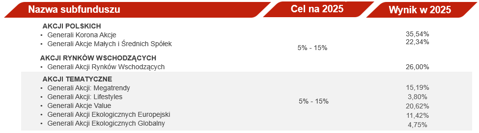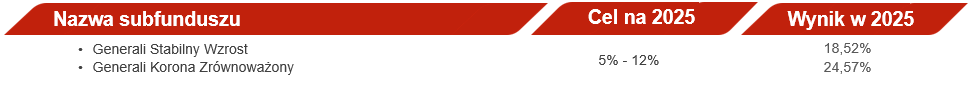 Źródło: opracowanie własne na dzień 31.12.2025 r. Wyniki osiągnięte w przeszłości nie gwarantują zwrotów z przyszłych inwestycji. Wynik będzie się różnić w zależności od funkcjonowania rynku i okresu posiadania inwestycji. Prezentowane wyniki netto nie uwzględniają opłat manipulacyjnych związanych z lokowaniem w dany subfundusz oraz podatków.