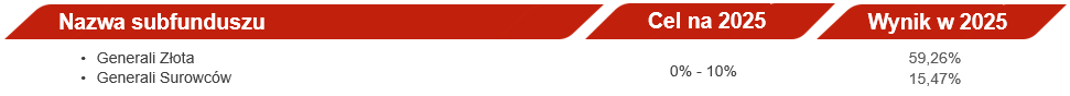 Subfundusze mieszane, których strategia zakłada połączenie elementów rynków dłużnych i akcyjnych, również odnotowały solidne wyniki. Oba komponenty w 2025 roku radziły sobie ponadprzeciętnie dobrze, dlatego też stopy zwrotu znacząco przewyższające nasze prognozy nie są zaskoczeniem.