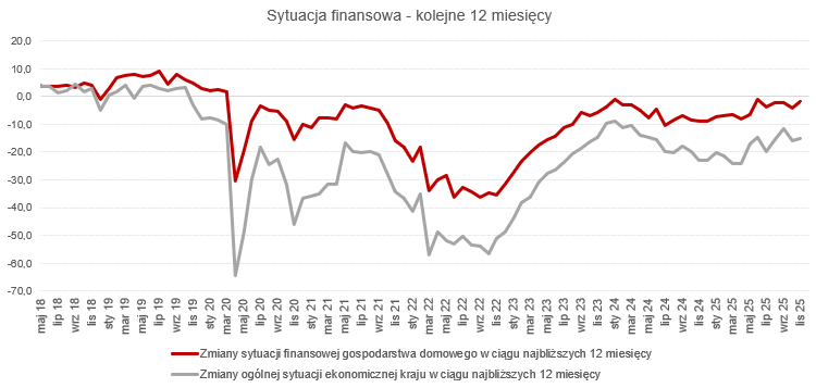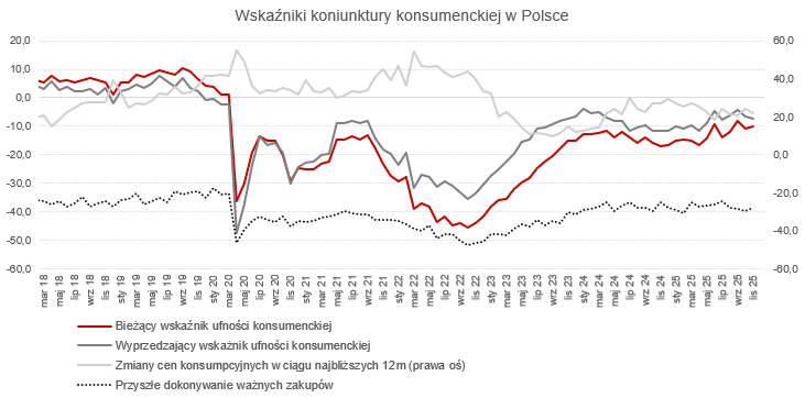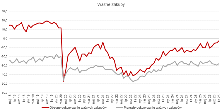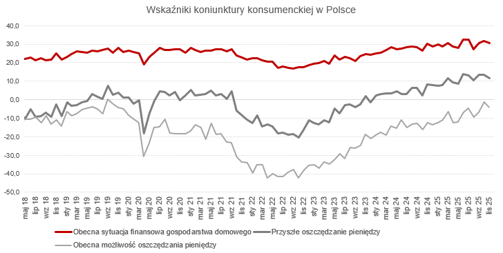 W listopadzie nastąpiła delikatna poprawa nastrojów konsumentów w Polsce. Bieżące nastroje konsumentów, mierzone bieżącym wskaźnikiem ufności konsumenckiej, pozostają na minusie i w porównaniu do października polepszyły się o 1 p.p. Wartość bieżącego wskaźnika ufności konsumenckiej (BWUK), publikowanego przez GUS, wyniosła -9,9%. Wartość wskaźnika wyprzedzającego spadła, ale Polacy nadal oceniają przyszłość z mniejszą dozą pesymizmu. Oczekiwania inflacyjne obniżyły się. Pogorszyła się ocena bieżącej sytuacji finansowej i ekonomicznej oraz obecnej możliwości oszczędzania pieniędzy. Podobnie jak w październiku polepszyła się ocena bieżącego dokonywania ważnych zakupów. Polepszyła się także ocena przyszłego ich dokonywania.