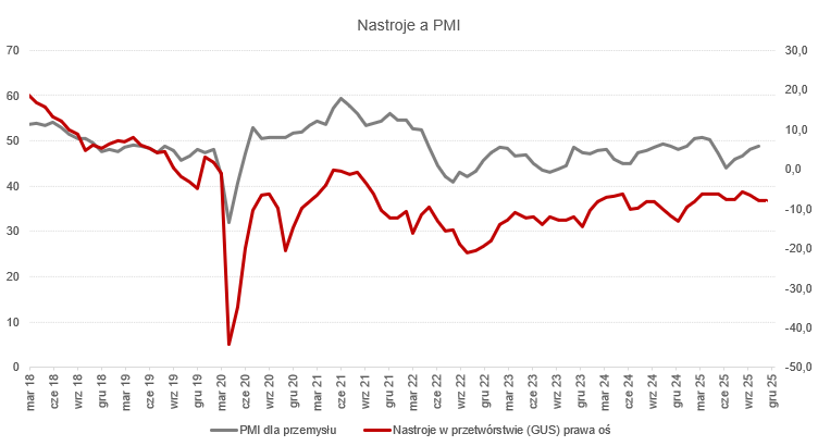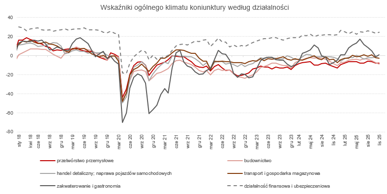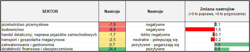 Zgodnie z informacjami podanymi przez GUS dynamiki nastrojów wśród polskich przedsiębiorców były mieszane. Najsilniej pogorszyły się nastroje w sektorze budowlanym, które zbliżyły się do poziomu pesymizmu obserwowanego w przetwórstwie przemysłowym (tutaj bardzo nieznaczna poprawa). Po silnym spadku w październiku stabilizują się nastroje w zakwaterowaniu i gastronomii, które to sektory powróciły do bardzo delikatnego optymizmu. Optymistycznie sytuację nadal oceniają podmioty z branży finansowej i ubezpieczeniowej.