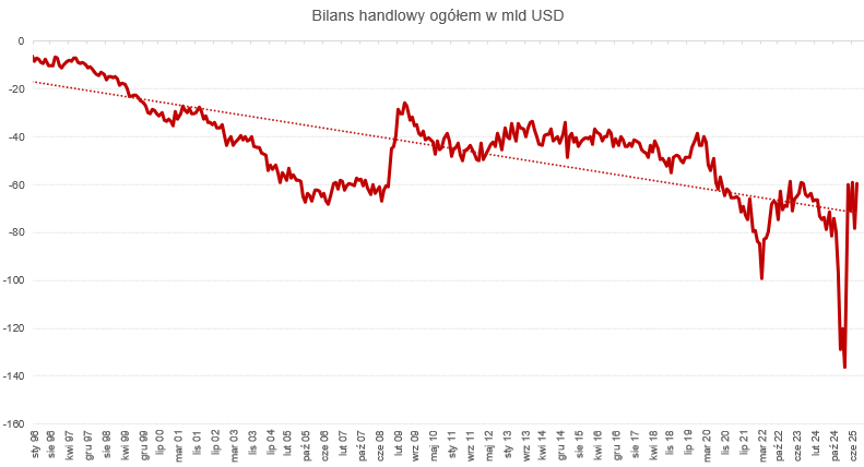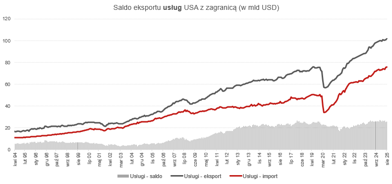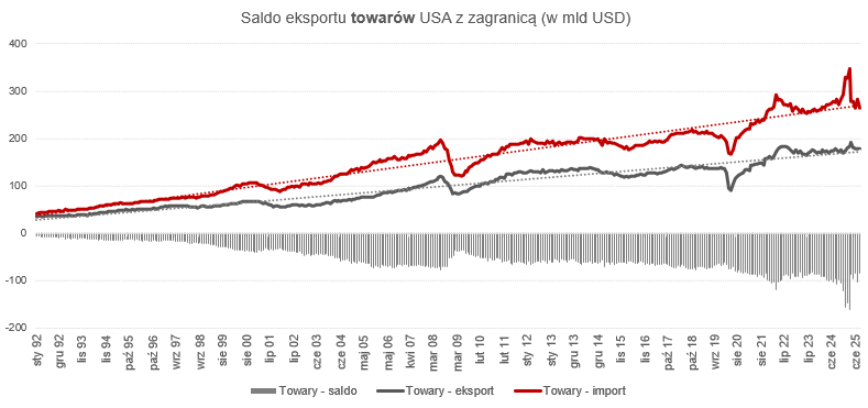 Saldo bilansu handlowego USA w sierpniu poprawiło się względem lipca. Deficyt spadł z 78,2 mld USD (po rewizji z 78,3 mld) do 59,6 mld USD wobec oczekiwań na poziomie 60,4 mld USD. Za spadek deficytu odpowiadał w największym stopniu spadek importu towarów, którego wartość miesięczna była najniższa w tym roku i niższa nominalnie o 3,8% r/r. Wartość eksportu towarów praktycznie nie uległa zmianie. W przypadku usług wzrosła zarówno wartość importu jak i eksportu. Saldo eksportu usług było dodatnie.
