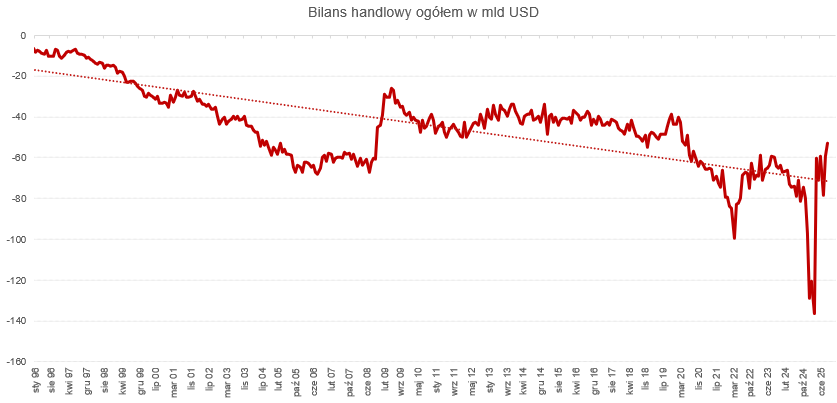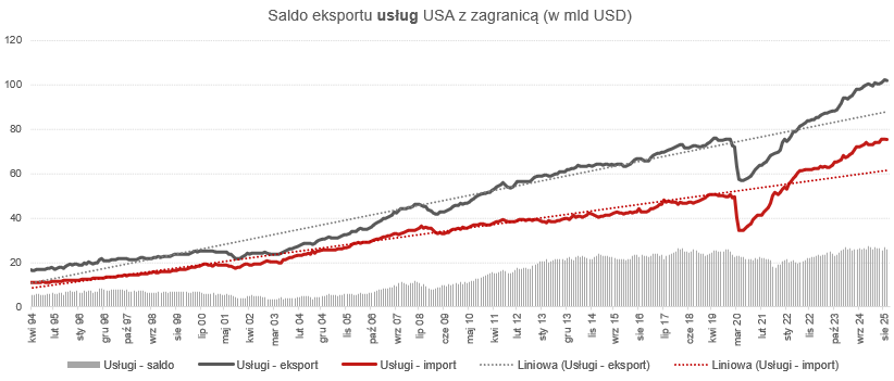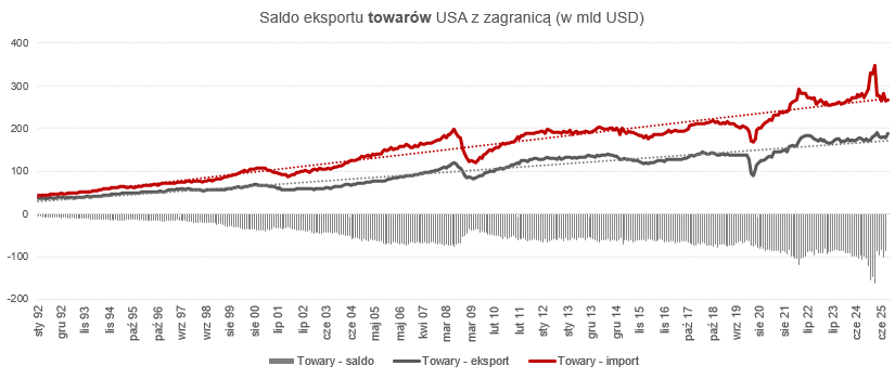 Spływają zaległe dane z gospodarki amerykańskiej. Saldo bilansu handlowego USA we wrześniu poprawiło się względem sierpnia. Poprawa nie była już tak dynamiczna jak w sierpniu. Była jednak solidna. Dodatkowo dane były dużo lepsze od oczekiwań na poziomie 63,1 mld USD. Deficyt spadł z 59,3 mld USD do 52,8 mld USD. Zarówno wolumen importu jak i wolumen eksportu rosły, jednak za spadek deficytu odpowiadał w największym stopniu wolniejszy wzrost importu towarów. W przypadku usług, nieznacznie wzrosła wartość importu i spadła wartość eksportu. Saldo eksportu usług było dodatnie, ale było niższe w stosunku do sierpnia.