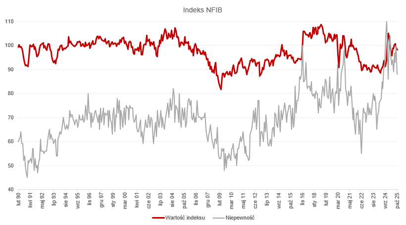 Publikowany przez National Federation of Independent Business wskaźnik optymizmu małych przedsiębiorstw (NFIB) wzrósł w listopadzie o 0,8 punktu do poziomu 99,0. Była to wartość wyższa od oczekiwań, które kształtowały się na poziomie około 98,3 pkt. Spośród 10 składników indeksu optymizmu sześć wzrosło, trzy spadły, a jeden pozostał bez zmian. Wzrost liczby osób spodziewających się wyższej sprzedaży rzeczywistej miał największy wpływ na wzrost indeksu optymizmu. Indeks niepewności wzrósł o 3 punkty w stosunku do października, osiągając poziom 91. Głównym czynnikiem wpływającym na wzrost indeksu niepewności był wzrost liczby właścicieli zgłaszających niepewność co do planów wydatków kapitałowych w ciągu najbliższych trzech do sześciu miesięcy.