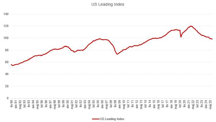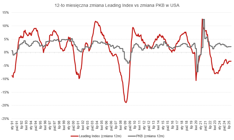 Wiodący indeks gospodarczy (Leading Index, LEI), opublikowany przez Conference Board dla Stanów Zjednoczonych, spadł we wrześniu 2025 r. o 0,3% − do poziomu 98,3, po spadku o 0,3% w sierpniu (skorygowanym w z -0,5%). Ogólnie rzecz biorąc, wskaźnik LEI spadł o 2,1% w ciągu sześciu miesięcy (od marca do września 2025 r.), co stanowi szybszy spadek niż 1,3% spadek odnotowany w poprzednim sześciomiesięcznym okresie (od września 2024 r. do marca 2025 r.). Zgodnie z informacjami z Conference Board za spadkiem indeksu stały głównie oczekiwania konsumentów i przedsiębiorstw. Pozytywnie na indeks wpływał wzrost cen akcji, wiodący indeks kredytowy oraz nowe zamówienia producentów na dobra kapitałowe niezwiązane z obronnością, z wyłączeniem samolotów. Wskaźnik LEI sugeruje spowolnienie aktywności gospodarczej pod koniec 2025 r. i na początku 2026 r., przy osłabieniu PKB po silnych wydatkach konsumenckich w połowie bieżącego roku i zakłóceniach w IV kwartale spowodowanych zamknięciem administracji federalnej. Ogólnie rzecz biorąc wzrost gospodarczy pozostaje niestabilny i nierównomierny, ponieważ przedsiębiorstwa dostosowują się do zmian poziomu ceł i słabszego tempa konsumpcji. Conference Board nadal podtrzymuje prognozę, że PKB wzrośnie o 1,8% w 2025 r., a następnie spadnie do 1,5% w 2026 r.