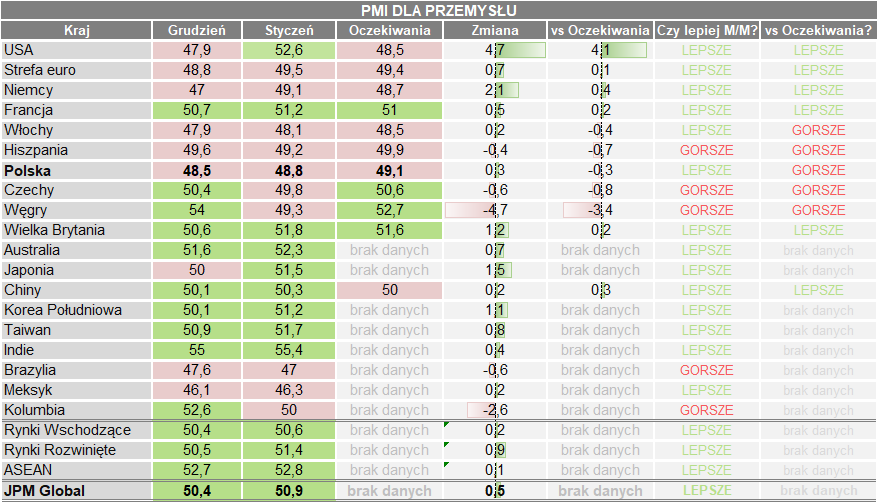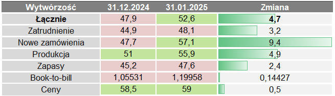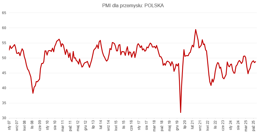 Wg informacji opublikowanych przez S&P Global styczniowy PMI na poziomie 48,8 pkt. potwierdza, że polski przemysł pozostaje poniżej progu koniunktury, ale tempo spowolnienia wyraźnie maleje. Wzrost indeksu szósty raz w ciągu siedmiu miesięcy oraz wyhamowanie spadków produkcji i nowych zamówień mogą świadczyć o tym, że możliwe jest przejście w kierunku poprawy sytuacji. Za stabilizacją przemawiają jednoczesne odbudowywanie zapasów i wzrost zaległości produkcyjnych. Ryzykiem krótkoterminowym jest ciągła redukcja zatrudnienia i słabość eksportu, nadal zależnego od kondycji gospodarki niemieckiej. Mimo to umiarkowana presja kosztowa i stabilne ceny wyrobów gotowych tworzą korzystne warunki dla poprawy marż, gdy tylko popyt zacznie rosnąć.