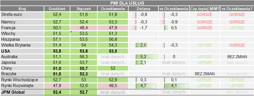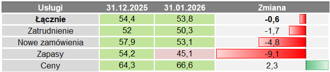 W styczniu wskaźnik ISM PMI dla przemysłu wyniósł 52,6%, co stanowi wzrost o 4,7 punktu procentowego w porównaniu z poziomem 47,9% odnotowanym w grudniu. Indeks nowych zamówień wzrósł po raz pierwszy od sierpnia 2025 r., osiągając poziom 57,1%. Jest to najwyższy odczyt od lutego 2022 r. (59,7%). Wynik indeksu produkcji za styczeń (55,9%) jest o 5,2 punktu procentowego wyższy od odczytu z grudnia, który wyniósł 50,7%, i najwyższy od lutego 2022 r., kiedy to osiągnął 58,1%. Presja cenowa pozostała wysoka, chociaż delikatnie osłabła. Indeks cen obniżył się z 59,5% do 59%. Sytuacja w zatrudnieniu poprawiła się. Indeks zatrudnienia wyniósł 48,1%, co stanowi wzrost o 3,3 punktu procentowego w porównaniu z grudniem. W przypadku usług wskaźnik ISM PMI nie zmienił się w stosunku do grudnia i pozostał na poziomie ekspansji wynoszącym 53,8%. Indeks nowych zamówień w styczniu również pozostał w fazie ekspansji, jednak jego wartość obniżyła się.