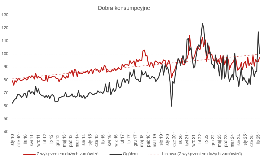 Według wstępnych danych Federalnego Urzędu Statystycznego (Destatis) realne nowe zamówienia w przemyśle wytwórczym wzrosły w grudniu 2025 r. o 7,8% w ujęciu miesięcznym, po korekcie sezonowej i kalendarzowej. Po wyłączeniu zamówień o dużej wartości nowe zamówienia były o 0,9% wyższe niż w poprzednim miesiącu. W ujęciu rok do roku zamówienia ogółem wzrosły o 12,6%, a po wyłączeniu dużych zamówień, o 2,12%. W kontekście problemów, z którymi boryka się przemysł niemiecki ważna jest struktura tych wzrostów. O 270% r/r wzrósł poziom zamówień na uzbrojenie i amunicję, a o 118% r/r na maszyny metalurgiczne. O 122% wzrósł poziom zamówień na maszyny latające (samoloty, drony inne) i maszyny związane z ich produkcją. W ujęciu m/m warto zwrócić uwagę na trwający okres wzrostu zamówień na dobra konsumpcyjne. Pod tym względem dynamika roczna również jest wysoka (+22% r/r). Dane te, w zestawieniu z opublikowanymi poziomami PMI, wskazują na stabilizację gospodarki niemieckiej i możliwe lepsze odczyty w nadchodzących miesiącach.