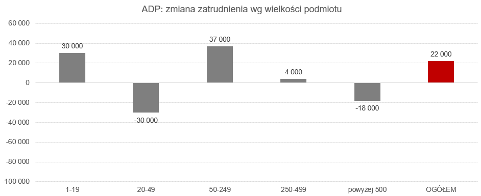 Dane za grudzień z raportu o zatrudnieniu, publikowanego przez Authomatic Data Processing (ADP), okazały się gorsze od oczekiwań. Liczba nowo zatrudnionych wzrosła o 22 tys. wobec oczekiwanego wzrostu na poziomie 45 tys. Z 41 tys. do 37 tys. zrewidowano dane za grudzień. Zatrudnienie spadło w firmach zatrudniających 20-49 osób oraz tych zatrudniających ponad 500 osób. W pozostałych grupach zatrudnienie rosło w każdej grupie przedsiębiorstw. 95% nowozatrudnionych przypadło na sektory usługowe.